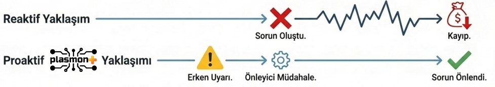 ISO 50001’in Planla–Uygula–Kontrol Et–Önlem Al (PDCA) yaklaşımıyla uyumlu çalışan Plasmon+; erken uyarılarla izleme ve analiz süreçlerini güçlendirir, alınan aksiyonların etkisini net şekilde takip etmeyi sağlar.